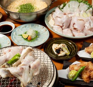 コース定番の料理に加えて、ぶつ切りのふぐ刺身やたたき、焼きふぐや白子などが楽しめるコース。