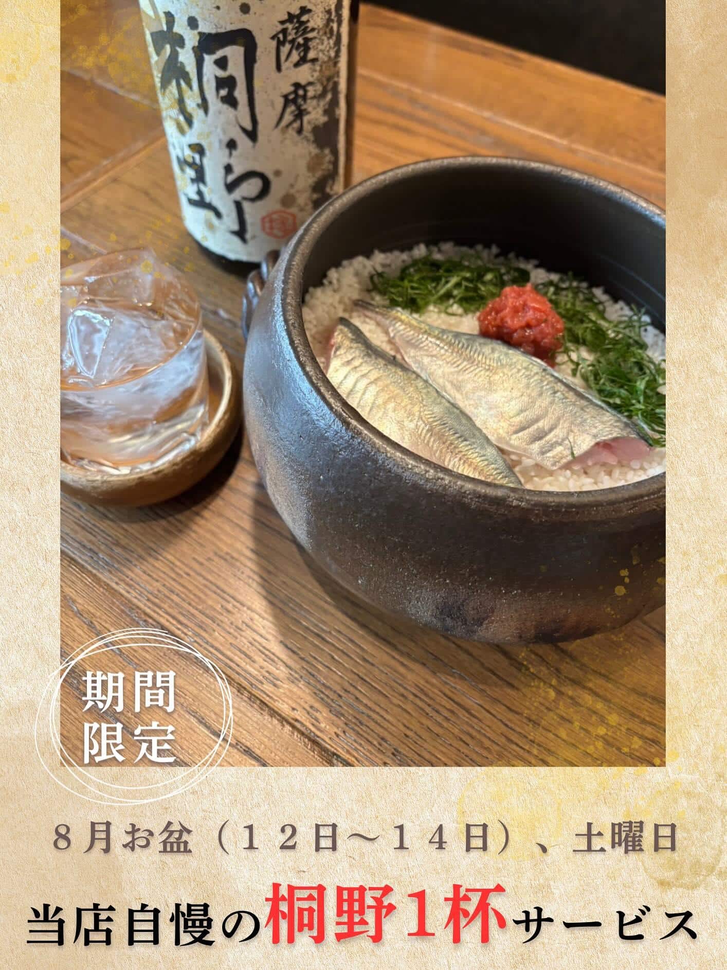 当店自慢の桐野を好きな割方で1杯サービスいたします♪