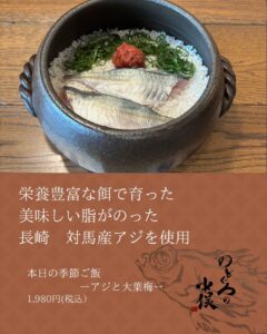 本日の土鍋ごはんは、長崎県対馬産のアジを使った大葉梅土鍋でございます!