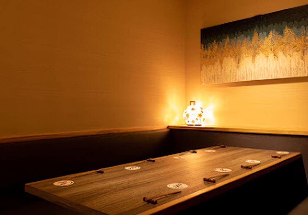 個室は古材を使用した温かみのあるデザインで、月明かりのような間接照明が特別な時間を演出します。