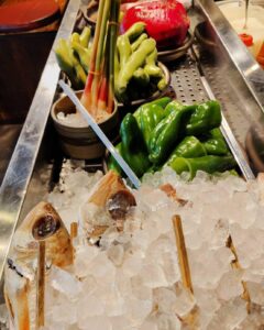 毎日豊洲市場で買い付けしております旬の焼き野菜と豪華お刺身の5点盛りをはじめとして、揚げたての自家製さつま揚げや当店の名物のどぐろの原始焼きがおひとり様一尾でご提供致します。