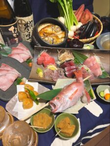 10種類の蔵元直送芋焼酎、名物刺身5点盛り、のどぐろの原始焼きの他、