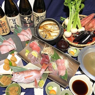 【忘新年会限定】鰤のしゃぶしゃぶと対馬産のど黒の原始焼きメインの茂助名物の鮮魚5点盛りや自家製さつま揚げなどを含む人気のコースです。